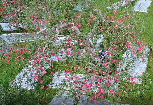 リンゴを接ぎ木する土台(台木)となるのがカイドウ(マルバカイドウやミツバカイドウ等)と呼ばれる赤い小さな実をつける植物なのです。